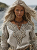 Kvinders Vintage Viking Celtic Knapper Broderet Kunst Linned Skjorte