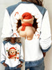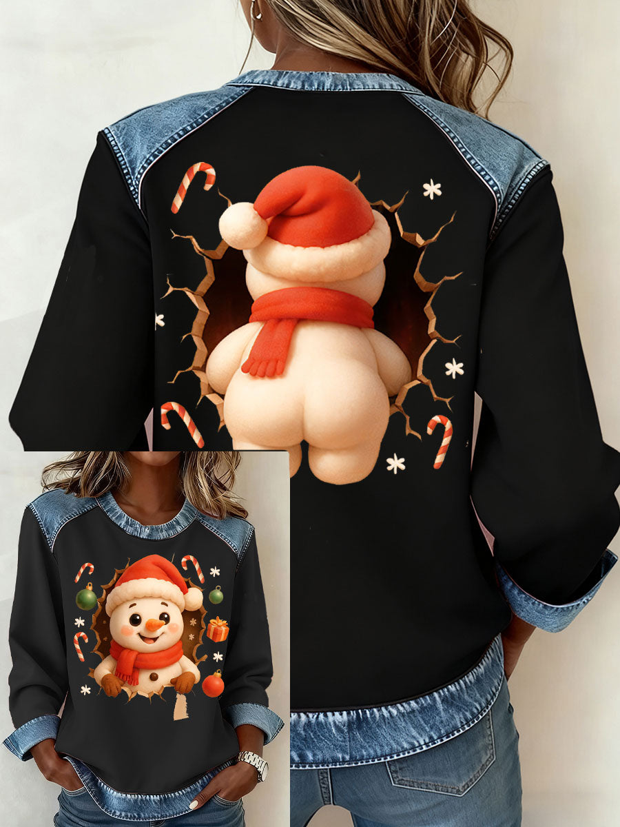 Kvinders patchwork-top i denim med sjov snemand til jul